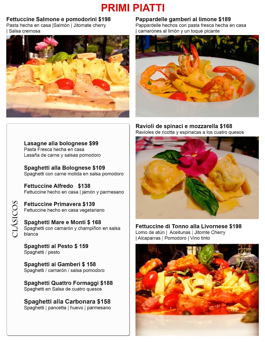 Moving on to Primi Piatti, the Pappardelle gamberi al Limone (MX$189) promises a taste of sun-kissed flavors, perfect for seafood lovers. The Secondi Piatti showcases the indulgent Filetto di manzo ai cuattro formaggi (MX$259), a sumptuous beef filet drizzled with a four-cheese sauce that leaves a lingering impression.